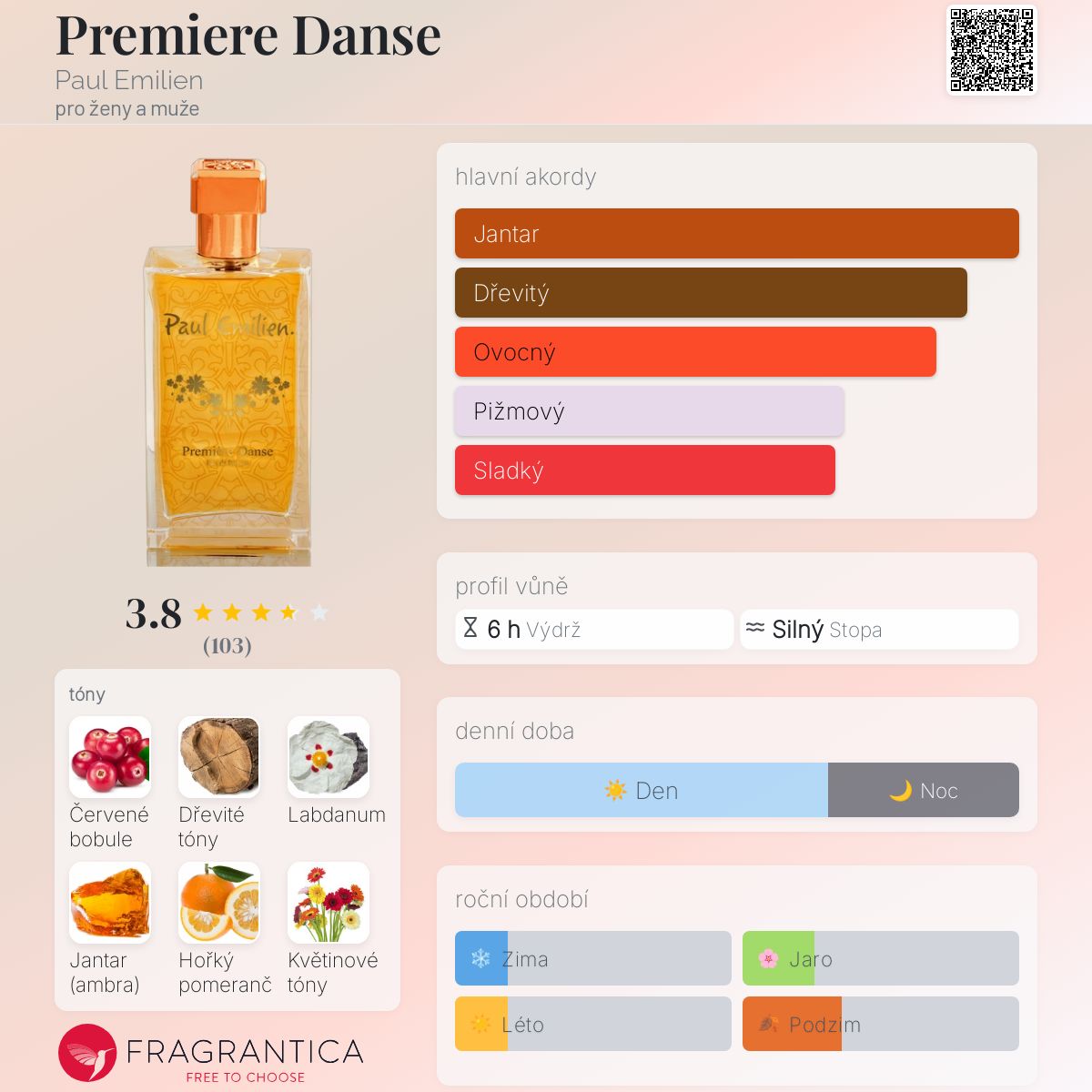 Premiere Danse podle Paul Emilien je Floral Woody Musk vůně pro ženy a muže. Premiere Danse byl/a uveden/a v roce 2014. "Nosem" za touto vůní je Patrick Bodifée. Vrchní tóny jsou Červené bobule a Hořký pomeranč; střední tóny jsouVzácné dřevo a Květinové tóny ; základní tóny jsou Španělské labdanum, Jantar (ambra) a Bílé pižmo.