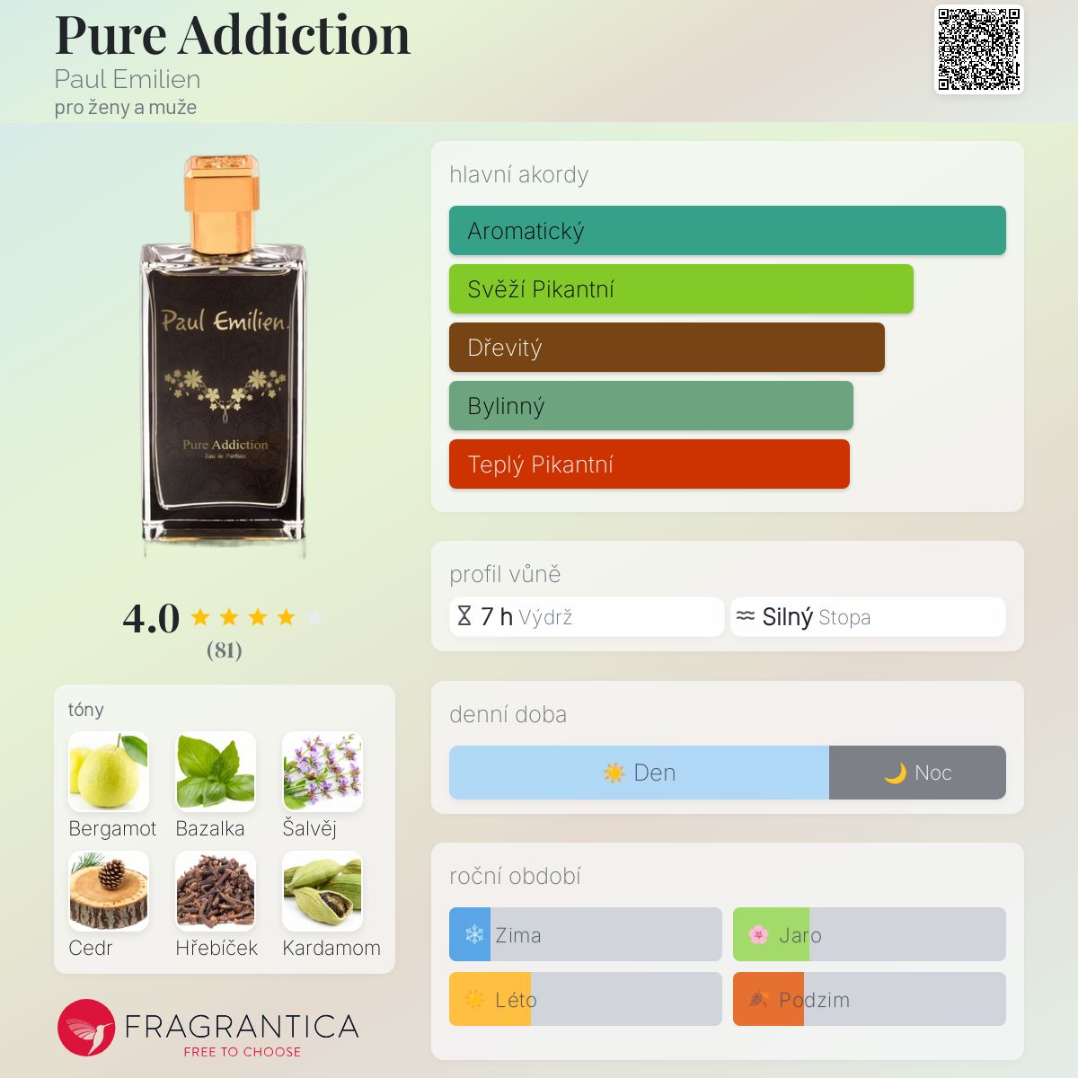 Pure Addiction podle Paul Emilien je Orientální Spicy vůně pro ženy a muže. Pure Addiction byl/a uveden/a v roce 2014. "Nosem" za touto vůní je Patrick Bodifée. Vrchní tóny jsou Bergamot, Bazalka, Hřebíček a Kardamom; střední tóny jsouŠalvěj, Cedr, Vzácné dřevo a Španělské labdanum ; základní tóny jsou Pačuli, Bílé pižmo a Jantar (ambra).
