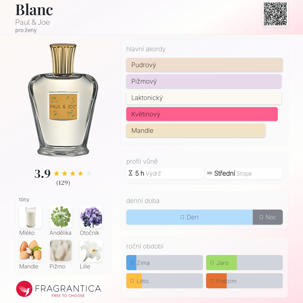 Blanc podle Paul & Joe je Floral vůně pro ženy. Blanc byl/a uveden/a v roce 2003. "Nosem" za touto vůní je Jean-Claude Ellena. Vrchní tóny jsou Andělika, Mandle a Hloh; střední tóny jsouLilie, Hrachor, Frézie a Růže ; základní tóny jsou Mléko, Otočník a Pižmo.
