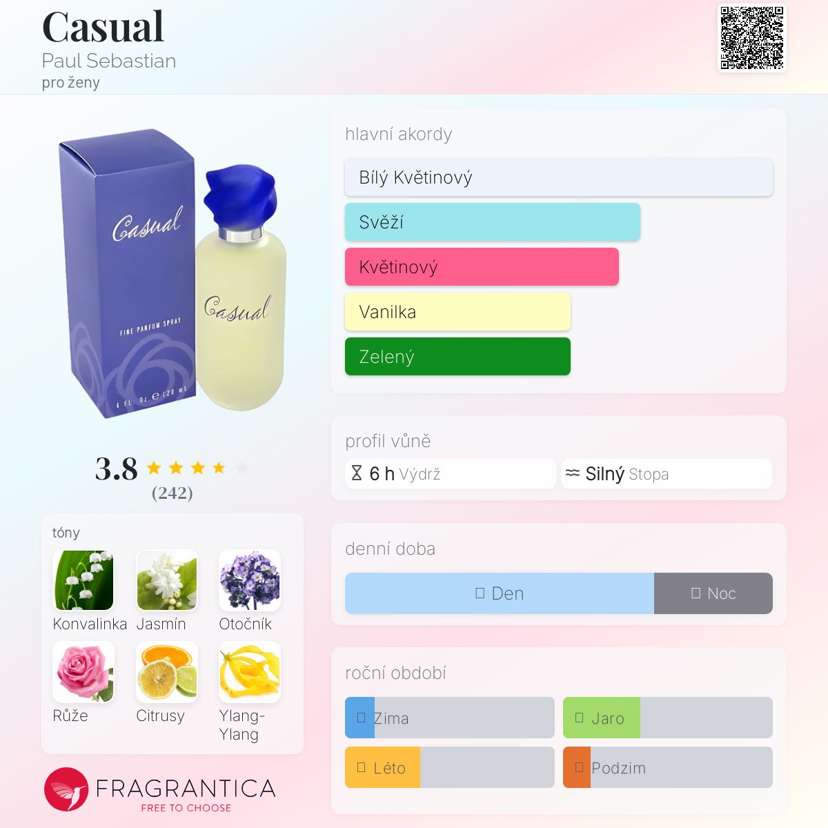 Casual podle Paul Sebastian je Floral vůně pro ženy. Casual byl/a uveden/a v roce 1995. Vrchní tóny jsou Konvalinka, Jasmín, Růže a Citrusy; střední tóny jsouYlang-Ylang, Brambořík a Ovocné tóny ; základní tóny jsou Otočník, Tuberóza a Fazole tonka.