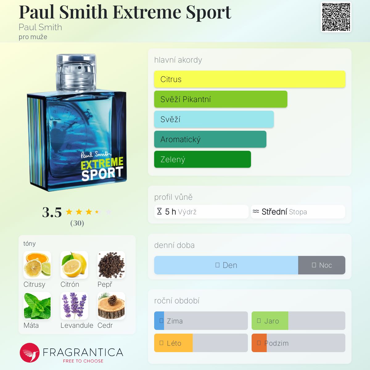 Paul Smith Extreme Sport podle Paul Smith je Woody Aromatic vůně pro muže. Paul Smith Extreme Sport byl/a uveden/a v roce 2014. Vrchní tóny jsou Citrusy, Citrón a Máta; střední tóny jsouPepř, Levandule a Pelargónie ; základní tóny jsou Cedr, Kadidlo a Fazole tonka.