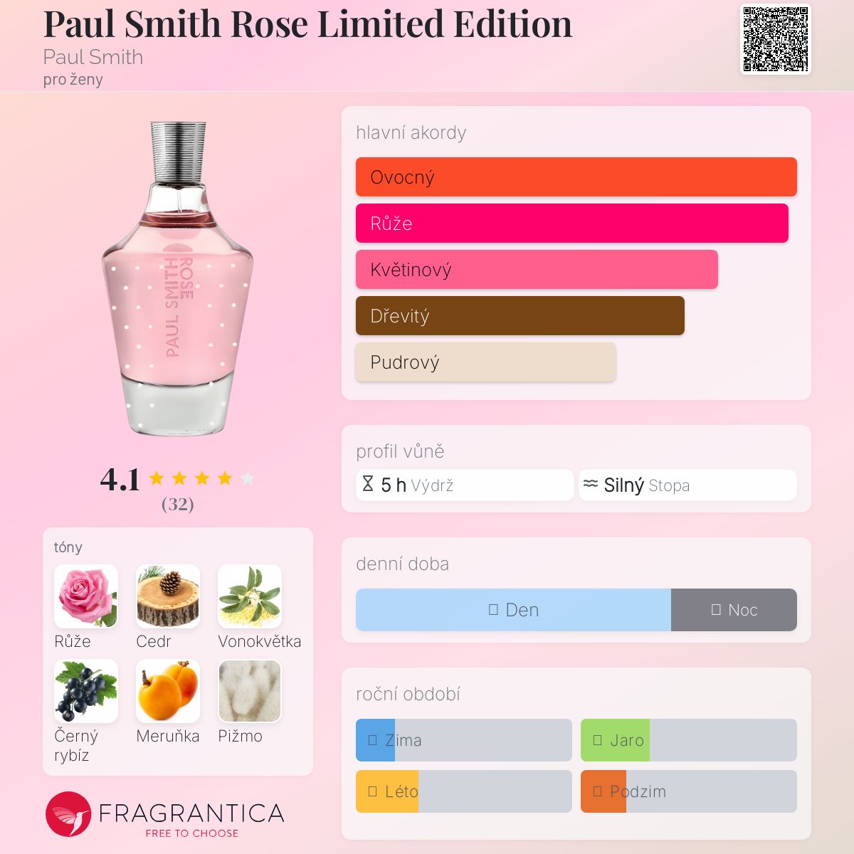 Paul Smith Rose Limited Edition podle Paul Smith je Floral vůně pro ženy. Paul Smith Rose Limited Edition byl/a uveden/a v roce 2014. Vrchní tóny jsou Černý rybíz, Meruňka a Bergamot; střední tóny jsouČajová růže, Vonokvětka a Velká jahoda ; základní tóny jsou Cedr, Bílé pižmo a Jantar (ambra).