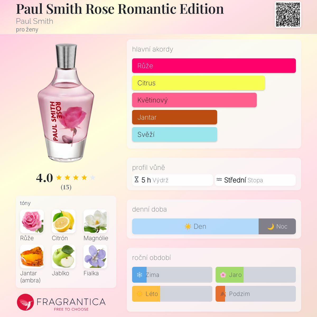 Paul Smith Rose Romantic Edition podle Paul Smith je Floral Fruity vůně pro ženy. Paul Smith Rose Romantic Edition byl/a uveden/a v roce 2016. "Nosem" za touto vůní je Antoine Maisondieu. Vrchní tóny jsou Citrón, Jablko a Růžový pepř; střední tóny jsouBulharská růže, Růže, Magnólie a Fialka ; základní tóny jsou Jantar (ambra), Bílé pižmo a Cedr.