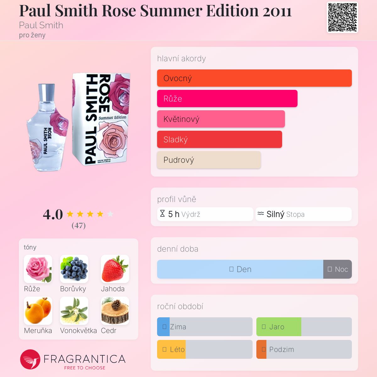 Paul Smith Rose Summer Edition 2011 podle Paul Smith je Floral Fruity vůně pro ženy. Paul Smith Rose Summer Edition 2011 byl/a uveden/a v roce 2011. Vrchní tóny jsou Borůvky, Meruňka a Bergamot; střední tóny jsouRůže, Velká jahoda a Vonokvětka ; základní tóny jsou Virginský cedr, Jantar (ambra) a Pižmo.