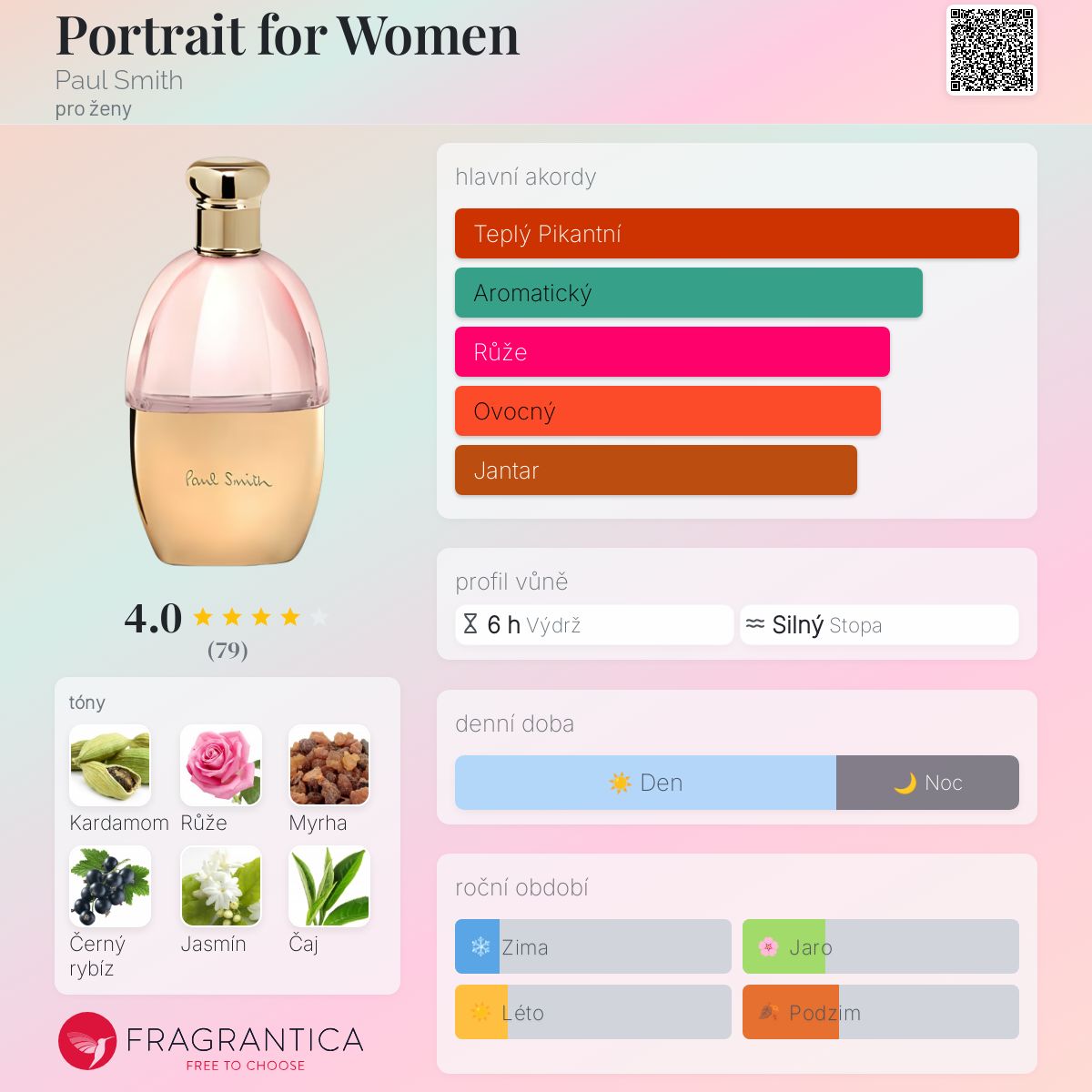 Portrait for Women podle Paul Smith je Floral Green vůně pro ženy. Portrait for Women byl/a uveden/a v roce 2013. "Nosem" za touto vůní je Barnabe Fillion. Vrchní tóny jsou Kardamom, Černý rybíz, Černý čaj, Bergamot a Broskev; střední tóny jsouDivoká růže a Jasmín ; základní tóny jsou Myrha a Pižmo.