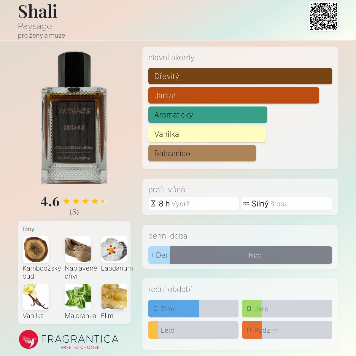 Shali podle Paysage je Orientální vůně pro ženy a muže. Shali byl/a uveden/a v roce 2021. Vrchní tóny jsou Kambodžský oud, Naplavené dříví a Labdanum; střední tóny jsouVanilka, Majoránka a Elimi ; základní tóny jsou Dubový mech, Cedr, Jantar (ambra) a Benzoin.