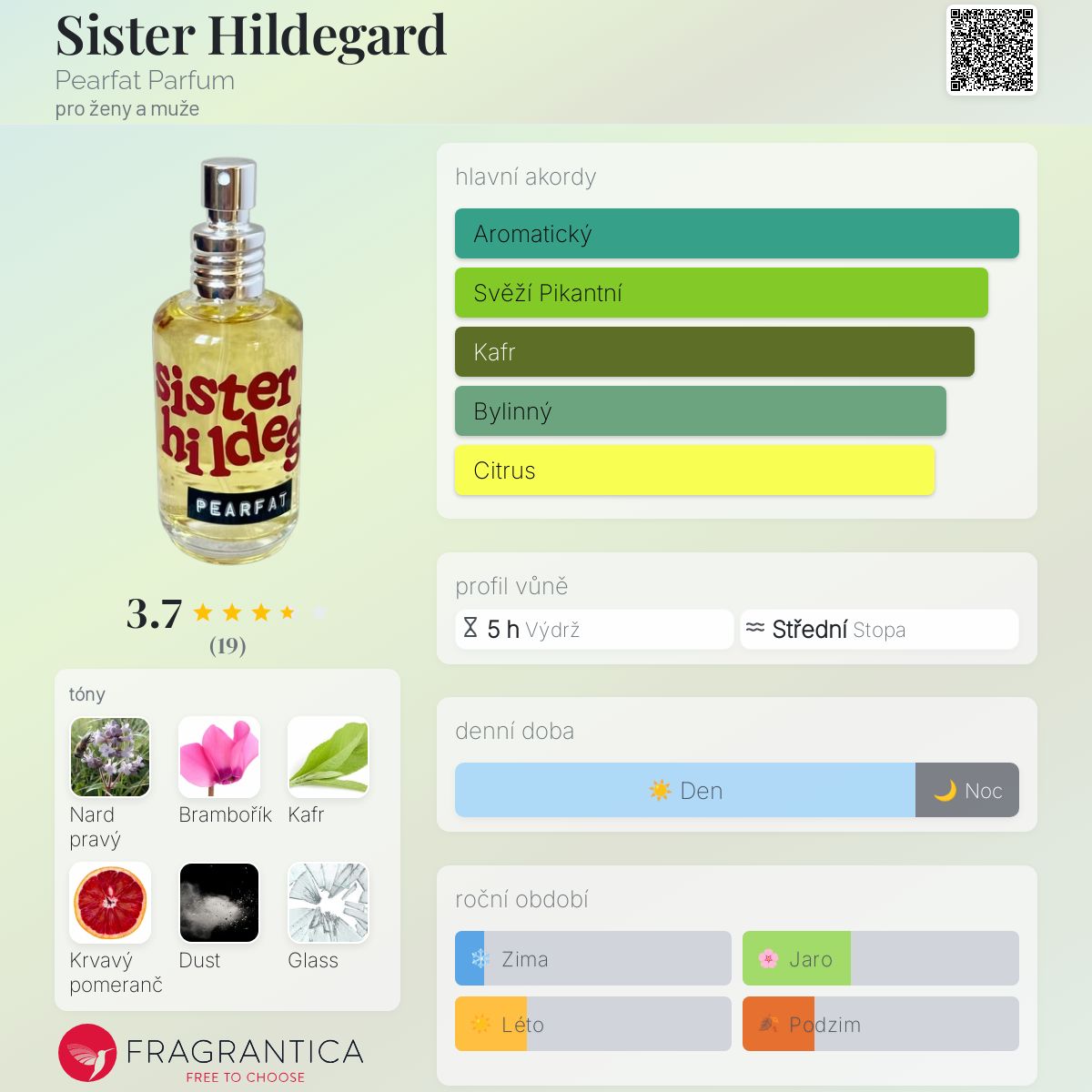 Sister Hildegard podle Pearfat Parfum je Woody Aromatic vůně pro ženy a muže. Toto je nová vůně. Sister Hildegard byl/a uveden/a v roce 2025. "Nosem" za touto vůní je Alie Kiral. Vrchní tóny jsou Krvavý pomeranč, Prach, Sklo a Elemi; střední tóny jsouMléko a Kadidlo ; základní tóny jsou Nard himálajský, Brambořík, Kafr a Dřevité tóny.