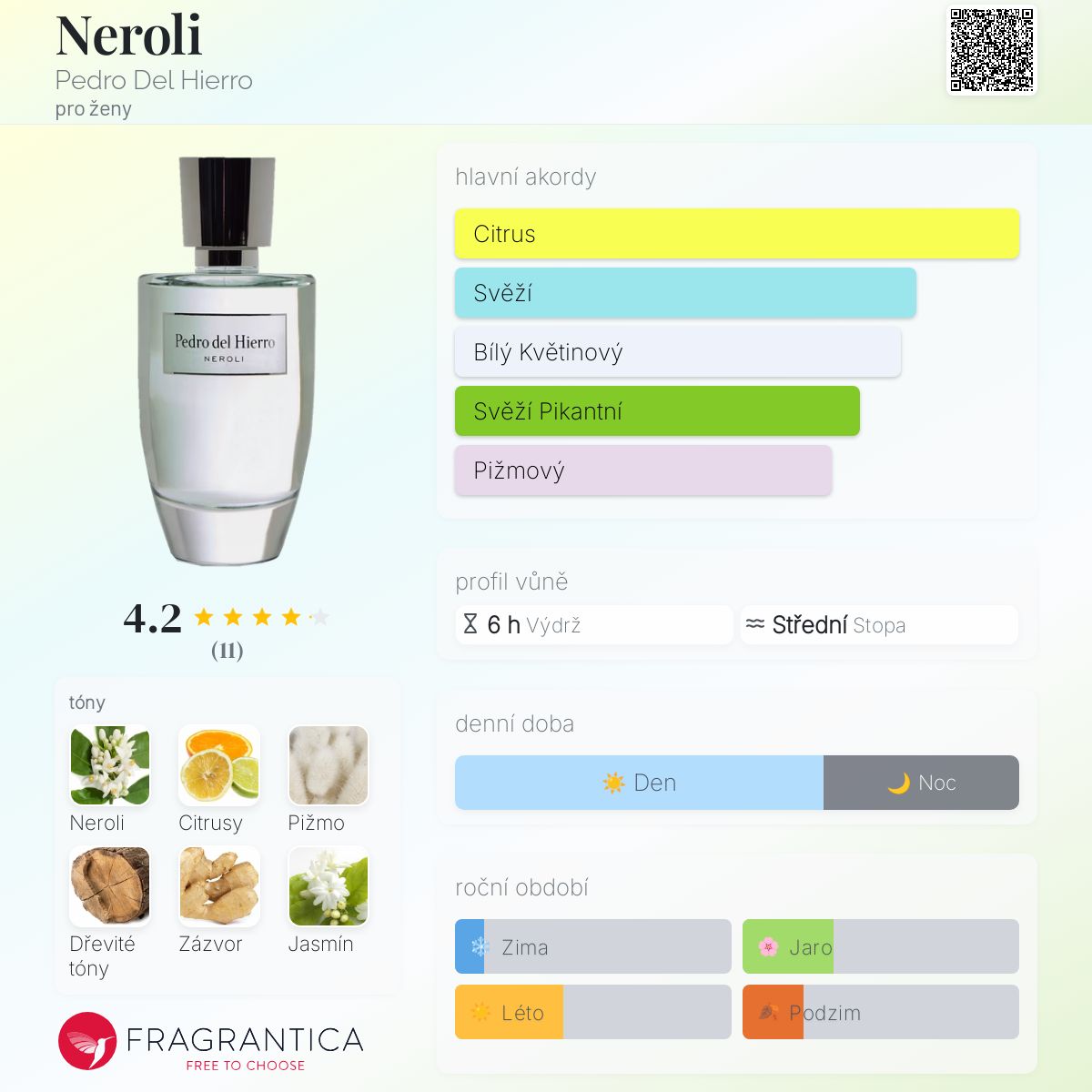 Neroli podle Pedro Del Hierro je Citrus Aromatic vůně pro ženy. Neroli byl/a uveden/a v roce 2018. "Nosem" za touto vůní je Jérôme di Marino. Vrchní tóny jsou Citrusy a Zázvor; střední tóny jsouNeroli a Jasmín ; základní tóny jsou Pižmo, Dřevité tóny a Jantar (ambra).