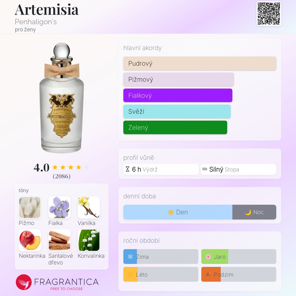Artemisia podle Penhaligon's je Orientální vůně pro ženy. Artemisia byl/a uveden/a v roce 2002. Vrchní tóny jsou Nektarinka a Zelené tóny; střední tóny jsouFialka, Vanilka, Konvalinka, Čaj, Jasmín a Zelené jablko ; základní tóny jsou Pižmo, Santalové dřevo, Dubový mech a Jantar (ambra).