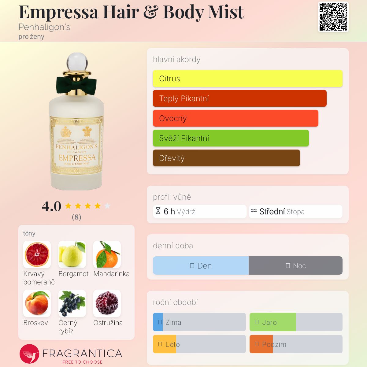 Empressa Hair & Body Mist podle Penhaligon's je Floral Fruity vůně pro ženy. Empressa Hair & Body Mist byl/a uveden/a v roce 2020. Vrchní tóny jsou Krvavý pomeranč, Bergamot a Mandarinka; střední tóny jsouBroskev, Černý rybíz, Ostružina, Růže, Neroli, Pelargónie a Kardamom ; základní tóny jsou Vanilka, Kakao, Olibanum, Jantar (ambra), Pižmo, Pačuli, Santalové dřevo a Maltol.