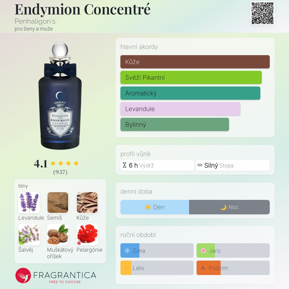 Endymion Concentré podle Penhaligon's je vůně pro ženy a muže. Endymion Concentré byl/a uveden/a v roce 2016. Vrchní tóny jsou Levandule, Šalvěj a Bergamot; střední tóny jsouSemiš a Pelargónie ; základní tóny jsou Kůže, Muškátový oříšek a Kadidlo.