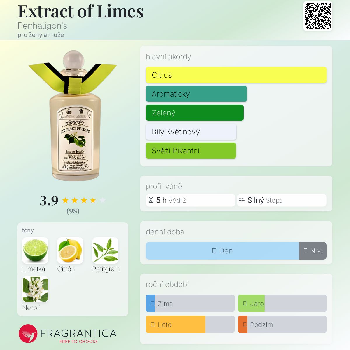 Extract of Limes podle Penhaligon's je Citrus vůně pro ženy a muže. Extract of Limes byl/a uveden/a v roce 1963. Vrchní tóny jsou Limetka, Citrón a Petitgrain; střední tón jeNeroli ;