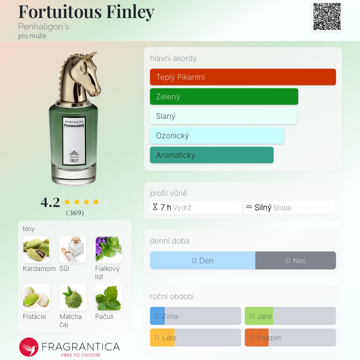 Fortuitous Finley podle Penhaligon's je Woody Spicy vůně pro muže. Toto je nová vůně. Fortuitous Finley byl/a uveden/a v roce 2025. "Nosem" za touto vůní je Caroline Dumur. Vrchní tóny jsou Kardamom, Badyán a Černý pepř; střední tóny jsouSůl, Pistácie a Matcha čaj ; základní tóny jsou Fialkový list, Pačuli a Kůže.