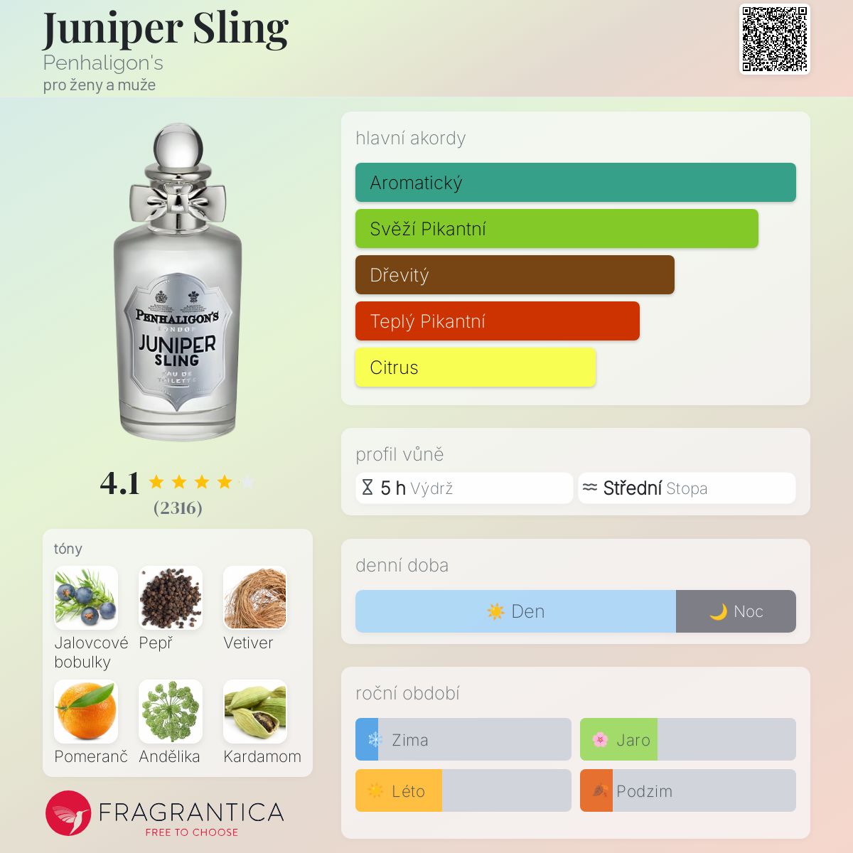 Juniper Sling podle Penhaligon's je Woody Spicy vůně pro ženy a muže. Juniper Sling byl/a uveden/a v roce 2011. "Nosem" za touto vůní je Olivier Cresp. Vrchní tóny jsou Jalovcové bobulky, Pomeranč, Andělika a Skořice; střední tóny jsouPepř, Kardamom, Kůže a Kořen orris ; základní tóny jsou Vetiver, Cukr, Třešeň a Jantar (ambra).