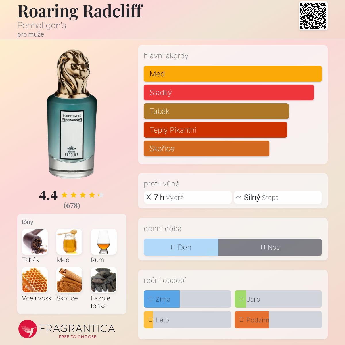 Roaring Radcliff podle Penhaligon's je Aromatic Spicy vůně pro muže. Roaring Radcliff byl/a uveden/a v roce 2016. "Nosem" za touto vůní je Daphné Bugey. Vrchní tóny jsou Rum, Bergamot a Estragon; střední tóny jsouTabák, Zázvor a Růže ; základní tóny jsou Med, Včelí vosk, Skořice, Fazole tonka, Jantarové dřevo a Kůže.