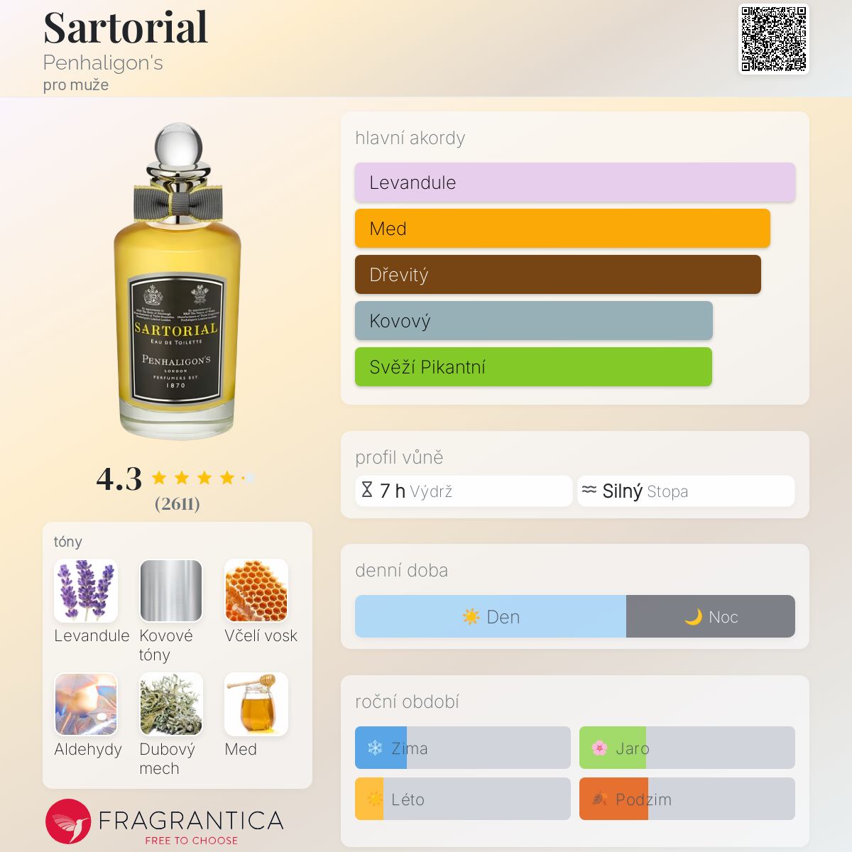 Sartorial podle Penhaligon's je Aromatic Fougere vůně pro muže. Sartorial byl/a uveden/a v roce 2010. "Nosem" za touto vůní je Bertrand Duchaufour. Vrchní tóny jsou Kovové tóny, Aldehydy, Kardamom, Vodní tóny, Černý pepř, Fialkový list, Zázvor a Neroli; střední tóny jsouLevandule, Včelí vosk, Kůže, Lipový květ a Brambořík ; základní tóny jsou Dubový mech, Med, Dřevité tóny, Pačuli, Fazole tonka, Jantar (ambra), Bílé pižmo, Vanilka, Myrha, Cedr a Gurjanský balzám.