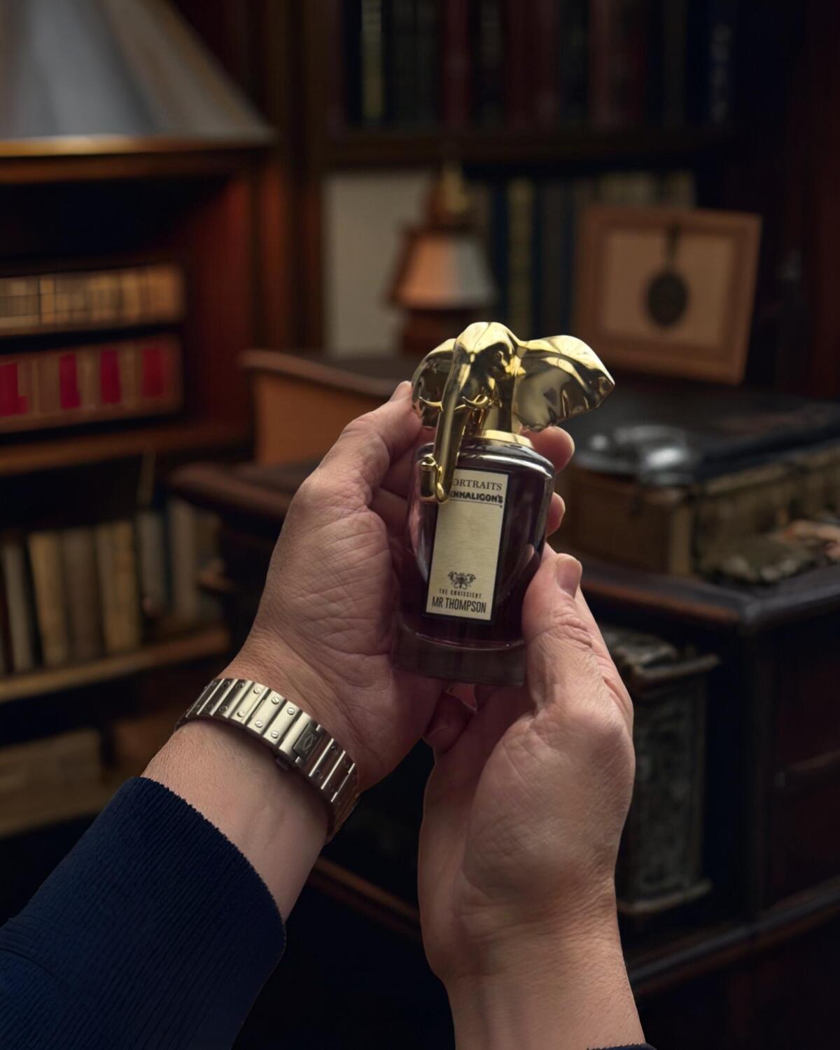 Pan Thompson je v podstatě pudrový, klasický, kosatcový parfém s elegantními svrchními tóny a jakýmsi pocitem tělnaté, gurmánsky načichlé, kůže. Složení mi okamžitě připomnělo parfém Dior Homme v tom smyslu, že je v něm cítit přehnaná hutnost, není příliš rozptýlená, spíše nízko položená na kůži, jelikož jde o "niche" značku a jako taková je drahá, byl to asi záměr. Při dnešním nošení se ve mně objevilo něco z toho ořechového aspektu Valentino Uomo, ale popravdě to bylo pomíjivé, a pokud studuji vzorec tohoto parfému do nejmenších detailů, řekl bych, že se pohybuje na půli cesty mezi Uomo a Homme. Znamená to ale, že je "jedinečná"??? (slovo, které mi řekla paní v obchodě Penhaligons) Ne. Ani ne, nepřipadá mi tak elegantní jako originál dior homme, v tomto ohledu se spíš podobá INtense nebo Parfum, ale v základu je víc tonky prominentní a to, jak mi ulpívá na oblečení, má trochu nestandardní, pšeničný nádech. Je to krásná sbírka tónů a akordů, které otevírají růžový pepř je krásný a to dostane všechny tělnaté s orrisem hned rychle jako, z nichž všechny se navzájem doplňují vykouzlit, že luxusní kožené věci, co možná zklame to je také jako mnoho z této kolekce, vrchní část je nabitá intrikami a základ jen tak prochází, ale nechápejte mě špatně, je to silný výlet, a pokud byste někdy byli nuceni koupit si některou z nich jen kvůli zátce, řekla bych, že Omniscient Mr Thompson by to byla. Sloní hlava je masivní!!!! asi třikrát větší než některé skromnější hlavy z této řady, její masivní dumbo uši a kly jsou kurevsky cool, přiznejme si to, jsem rád, že šťáva tomu trochu odpovídá.