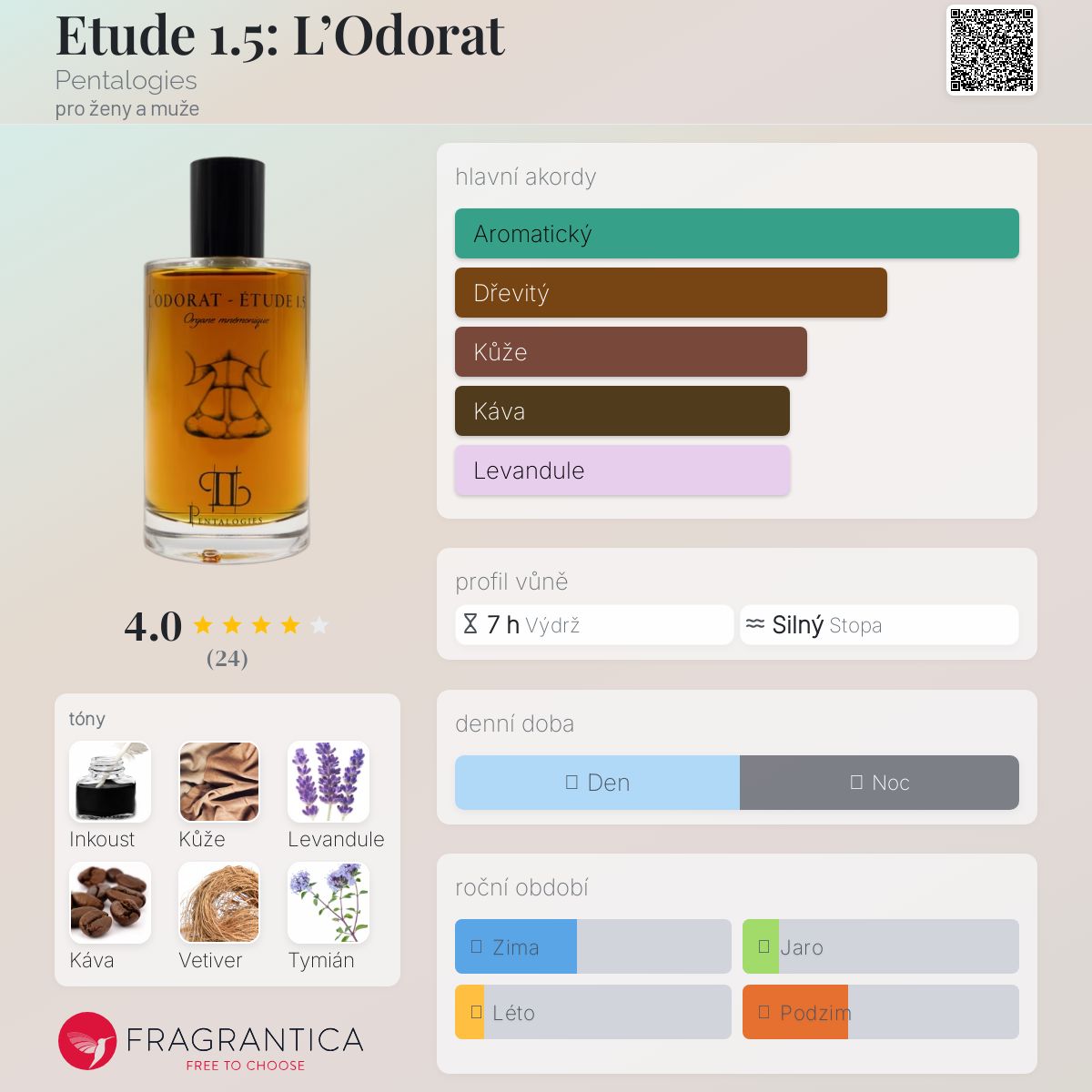 Etude 1.5: L’Odorat podle Pentalogies je Leather vůně pro ženy a muže. Etude 1.5: L’Odorat byl/a uveden/a v roce 2020. "Nosem" za touto vůní je Clementine Humeau. Vrchní tóny jsou Levandule, Tymián, Anýz, Andělika a Brambořík; střední tóny jsouInkoust, Káva, Amyris a Jantar (ambra) ; základní tóny jsou Kůže, Vetiver, Opoponax, Papyrus, Šafrán, Myrha a Labdanum.