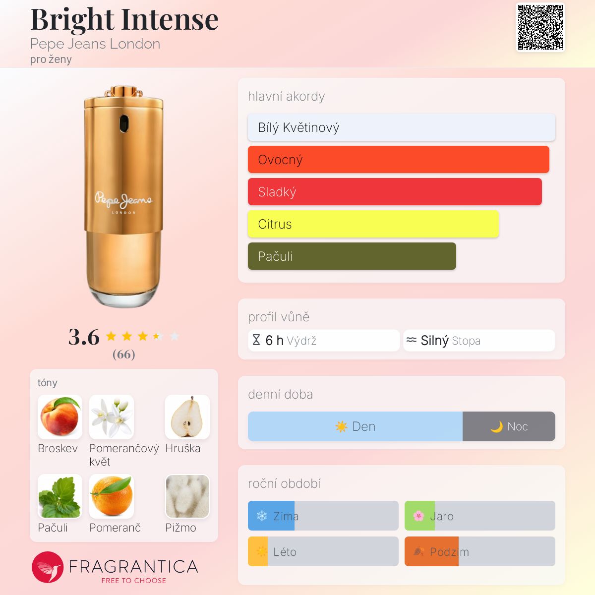 Bright Intense podle Pepe Jeans London je vůně pro ženy. Toto je nová vůně. Bright Intense byl/a uveden/a v roce 2024. Vrchní tóny jsou Broskev, Hruška a Pomeranč; střední tóny jsouPomerančový květ a Jasmín ; základní tóny jsou Pačuli, Pižmo a Fazole tonka.