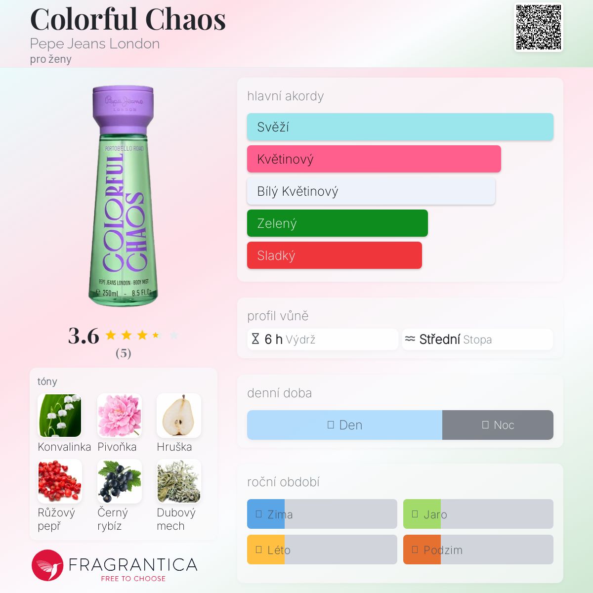 Colorful Chaos podle Pepe Jeans London je Floral Fruity vůně pro ženy. Toto je nová vůně. Colorful Chaos byl/a uveden/a v roce 2025. "Nosem" za touto vůní je Marine Ipert. Vrchní tóny jsou Hruška, Růžový pepř, Černý rybíz a Liči; střední tóny jsouKonvalinka, Pivoňka a Růže ; základní tóny jsou Mech, Cedr a Pižmo.