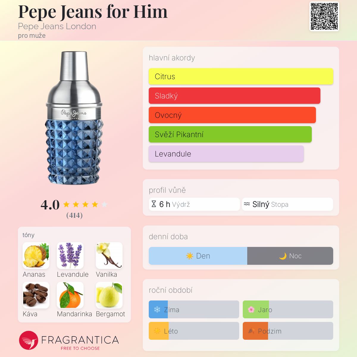 Pepe Jeans for Him podle Pepe Jeans London je Aromatic Fruity vůně pro muže. Pepe Jeans for Him byl/a uveden/a v roce 2018. "Nosem" za touto vůní je Jérôme di Marino. Vrchní tóny jsou Ananas, Mandarinka a Bergamot; střední tóny jsouLevandule a Muškátový oříšek ; základní tóny jsou Vanilka, Pražená kávová zrna a Jantarové dřevo.