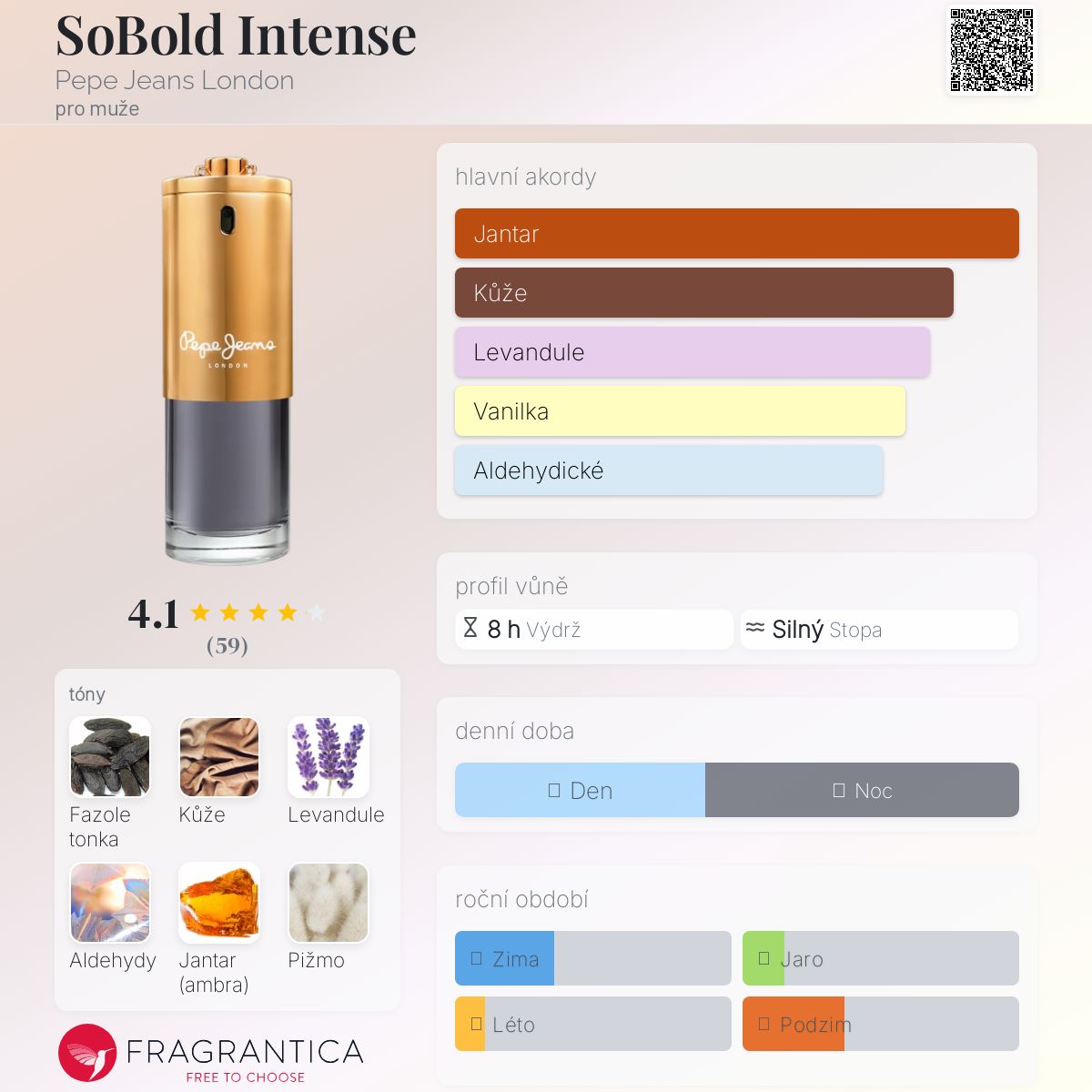 SoBold Intense podle Pepe Jeans London je vůně pro muže. Toto je nová vůně. SoBold Intense byl/a uveden/a v roce 2024. Vrchní tóny jsou Aldehydy a Citrusy; střední tóny jsouFazole tonka, Kůže a Levandule ; základní tóny jsou Jantar (ambra) a Pižmo.
