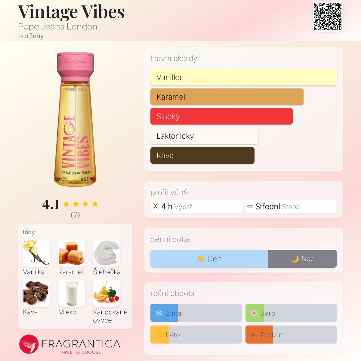 Vintage Vibes podle Pepe Jeans London je Orientální Vanilla vůně pro ženy. Toto je nová vůně. Vintage Vibes byl/a uveden/a v roce 2025. "Nosem" za touto vůní je Gaël Montero. Vrchní tóny jsou Káva, Mléko a Kandované ovoce; střední tóny jsouKaramel a Šlehačka ; základní tóny jsou Vanilka a Pižmo.