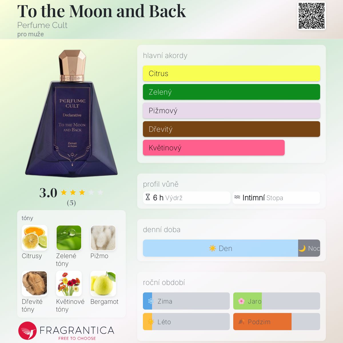 To the Moon and Back podle Perfume Cult je Chypre Floral vůně pro muže. To the Moon and Back byl/a uveden/a v roce 2023. "Nosem" za touto vůní je Pierre-Constantin Guéros. Vrchní tóny jsou Citrusy, Zelený tón, Bergamot, Citrón a Mandarinka; střední tóny jsouKvětinové tóny, Konvalinka, Jasmín a Palisandr ; základní tóny jsou Pižmo, Dřevité tóny, Cedr a Jantar (ambra).