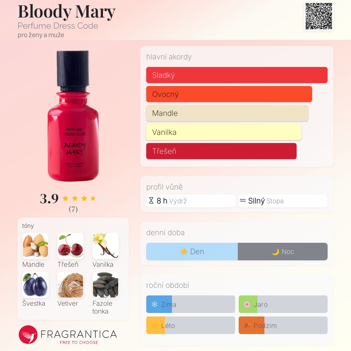 Bloody Mary podle Perfume Dress Code je Orientální Vanilla vůně pro ženy a muže. Bloody Mary byl/a uveden/a v roce 2023. Vrchní tóny jsou Hořká mandle a Třešeň; střední tóny jsouTřešeň, Švestka a Růže ; základní tóny jsou Vanilka, Vetiver, Fazole tonka, Santalové dřevo a Pačuli.