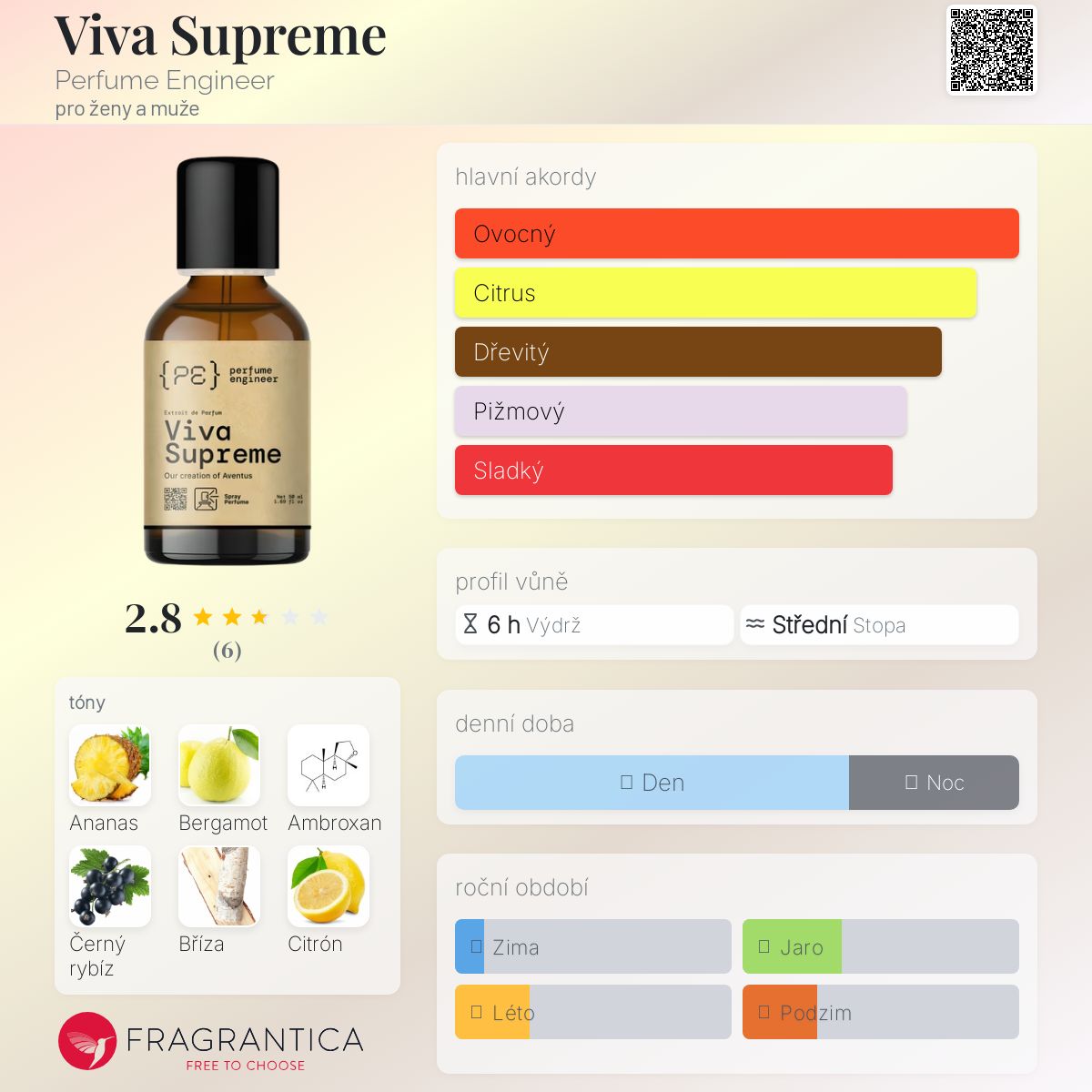 Viva Supreme podle Perfume Engineer je Chypre vůně pro ženy a muže. Toto je nová vůně. Viva Supreme byl/a uveden/a v roce 2024. "Nosem" za touto vůní je Helmi Hasan. Vrchní tóny jsou Ananas, Bergamot, Černý rybíz, Citrón a Růžový pepř; střední tóny jsouPačuli, Růže, Jasmín a Neroli ; základní tóny jsou Ambroxan, Bříza, Pižmo, Dubový mech a Dřevité tóny.