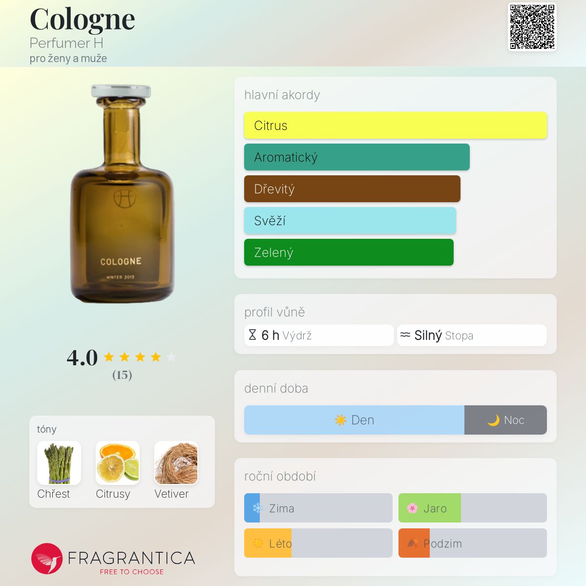 Cologne podle Perfumer H je Citrus Aromatic vůně pro ženy a muže. Cologne byl/a uveden/a v roce 2015. "Nosem" za touto vůní je Lyn Harris.