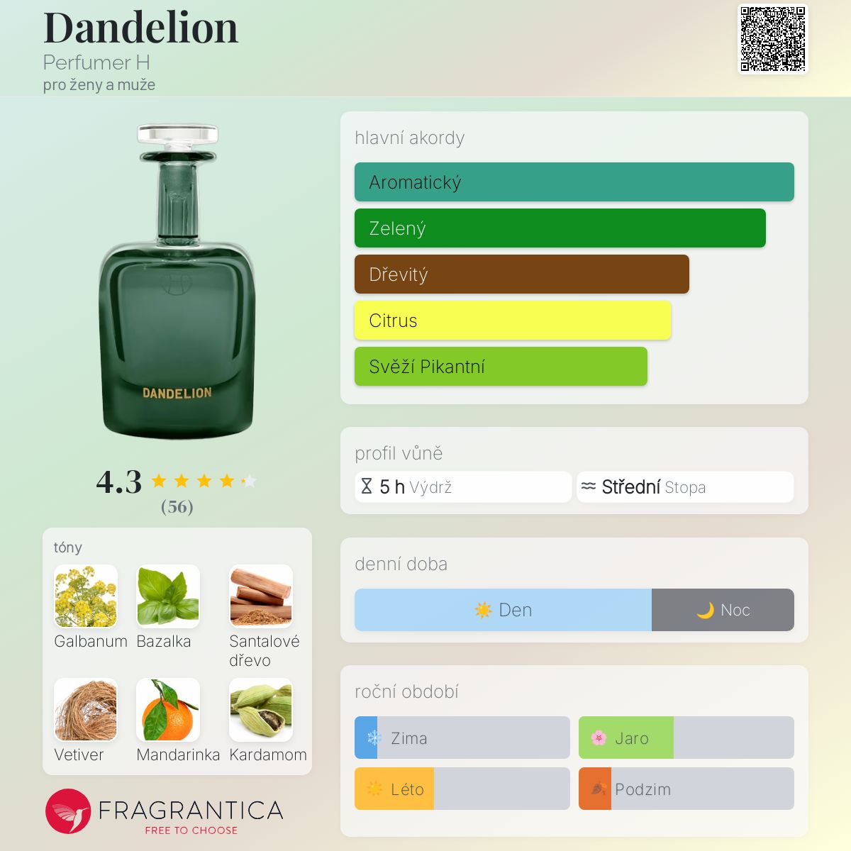 Dandelion podle Perfumer H je Floral vůně pro ženy a muže. Toto je nová vůně. Dandelion byl/a uveden/a v roce 2024. "Nosem" za touto vůní je Lyn Harris.