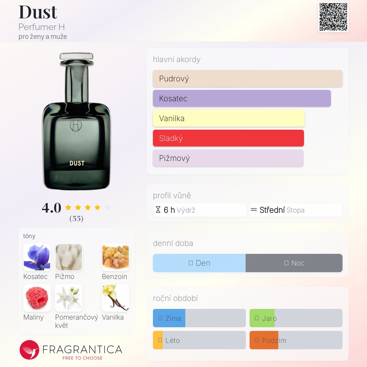 Dust podle Perfumer H je Floral vůně pro ženy a muže. Dust byl/a uveden/a v roce 2019. "Nosem" za touto vůní je Lyn Harris.