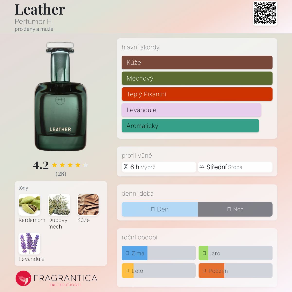 Leather podle Perfumer H je Aromatic Fougere vůně pro ženy a muže. Leather byl/a uveden/a v roce 2015. "Nosem" za touto vůní je Lyn Harris.