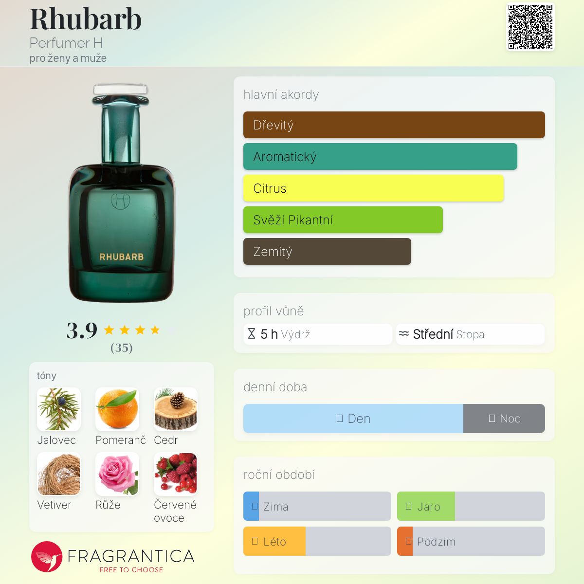 Rhubarb podle Perfumer H je Woody Aromatic vůně pro ženy a muže. Rhubarb byl/a uveden/a v roce 2023. "Nosem" za touto vůní je Lyn Harris.