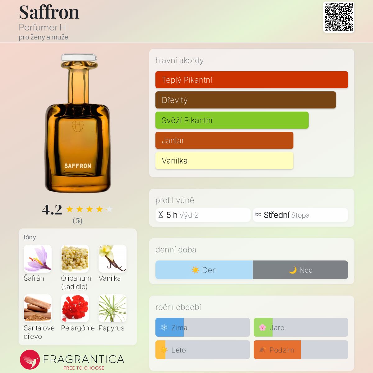 Saffron podle Perfumer H je Aromatic Spicy vůně pro ženy a muže. Saffron byl/a uveden/a v roce 2023. "Nosem" za touto vůní je Lyn Harris.