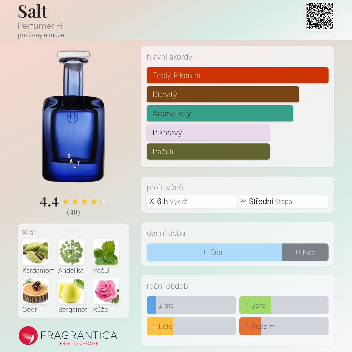 Salt podle Perfumer H je Woody Aromatic vůně pro ženy a muže. Salt byl/a uveden/a v roce 2020. "Nosem" za touto vůní je Lyn Harris.