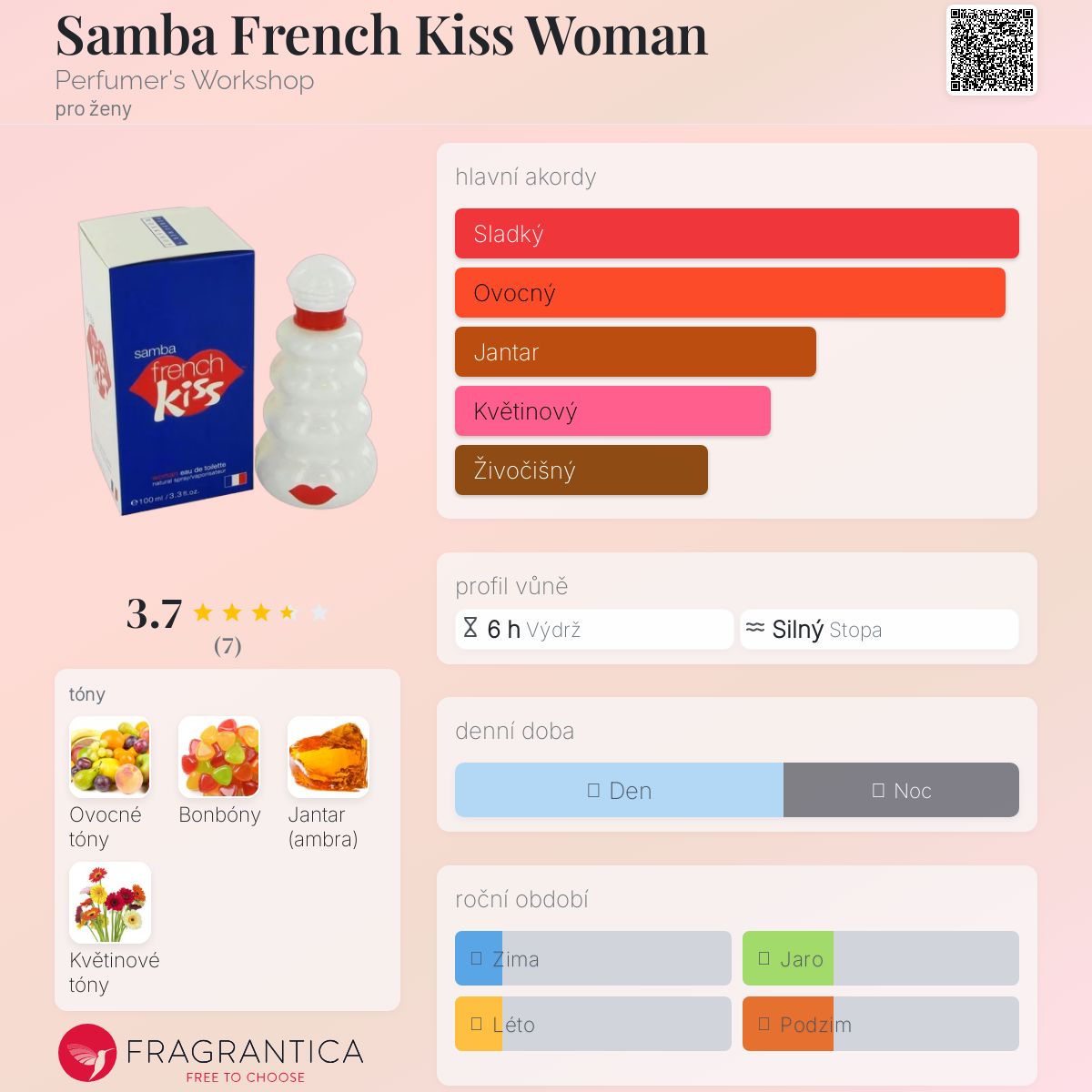 Samba French Kiss Woman podle Perfumer's Workshop je Floral Fruity vůně pro ženy. Samba French Kiss Woman byl/a uveden/a v roce 2001. Vrchní tóny jsou Ovocné tóny a Sladké tóny; střední tón jeKvětinové tóny ; základní tón je Jantar (ambra).