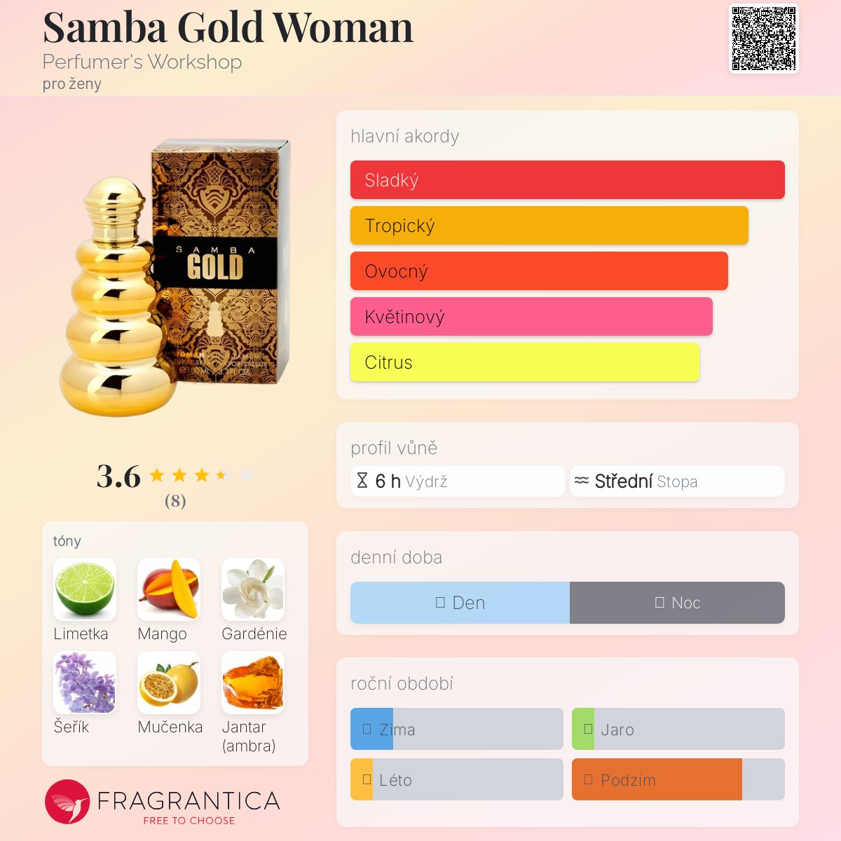 Samba Gold Woman podle Perfumer's Workshop je Floral Fruity vůně pro ženy. Samba Gold Woman byl/a uveden/a v roce 2014. Vrchní tóny jsou Limetka, Mango, Mučenka a Guava; střední tóny jsouGardénie, Šeřík, Magnólie a Zimolez ; základní tóny jsou Jantar (ambra), Pižmo, Pralinka a Kořen orris.