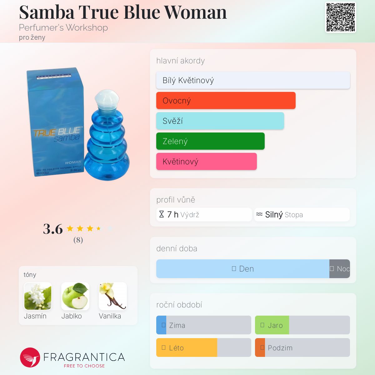 Samba True Blue Woman podle Perfumer's Workshop je Floral Green vůně pro ženy. Samba True Blue Woman byl/a uveden/a v roce 2001.