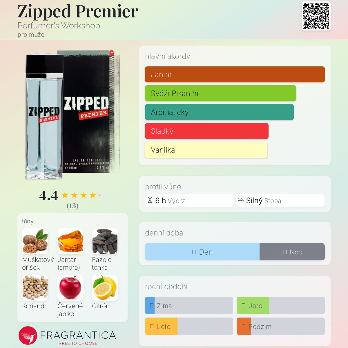 Zipped Premier podle Perfumer's Workshop je Aromatic Spicy vůně pro muže. Zipped Premier byl/a uveden/a v roce 2011. "Nosem" za touto vůní je Pierre Negrin. Vrchní tóny jsou Koriandr, Červené jablko, Citron amalfi a Mandarinka; střední tóny jsouMuškátový oříšek, Levandule a Fialka ; základní tóny jsou Jantar (ambra), Fazole tonka, Pižmo a Dřevité tóny.