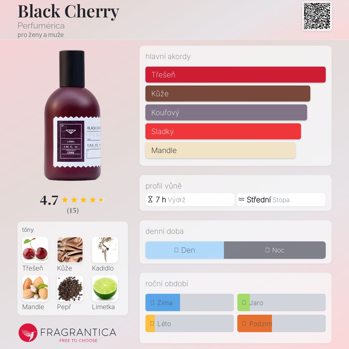 Black Cherry podle Perfumérica je vůně pro ženy a muže. Toto je nová vůně. Black Cherry byl/a uveden/a v roce 2024. Vrchní tóny jsou Třešeň a Limetka; střední tóny jsouMandle, Černý pepř a Pačuli ; základní tóny jsou Kůže, Kadidlo a Santalové dřevo.