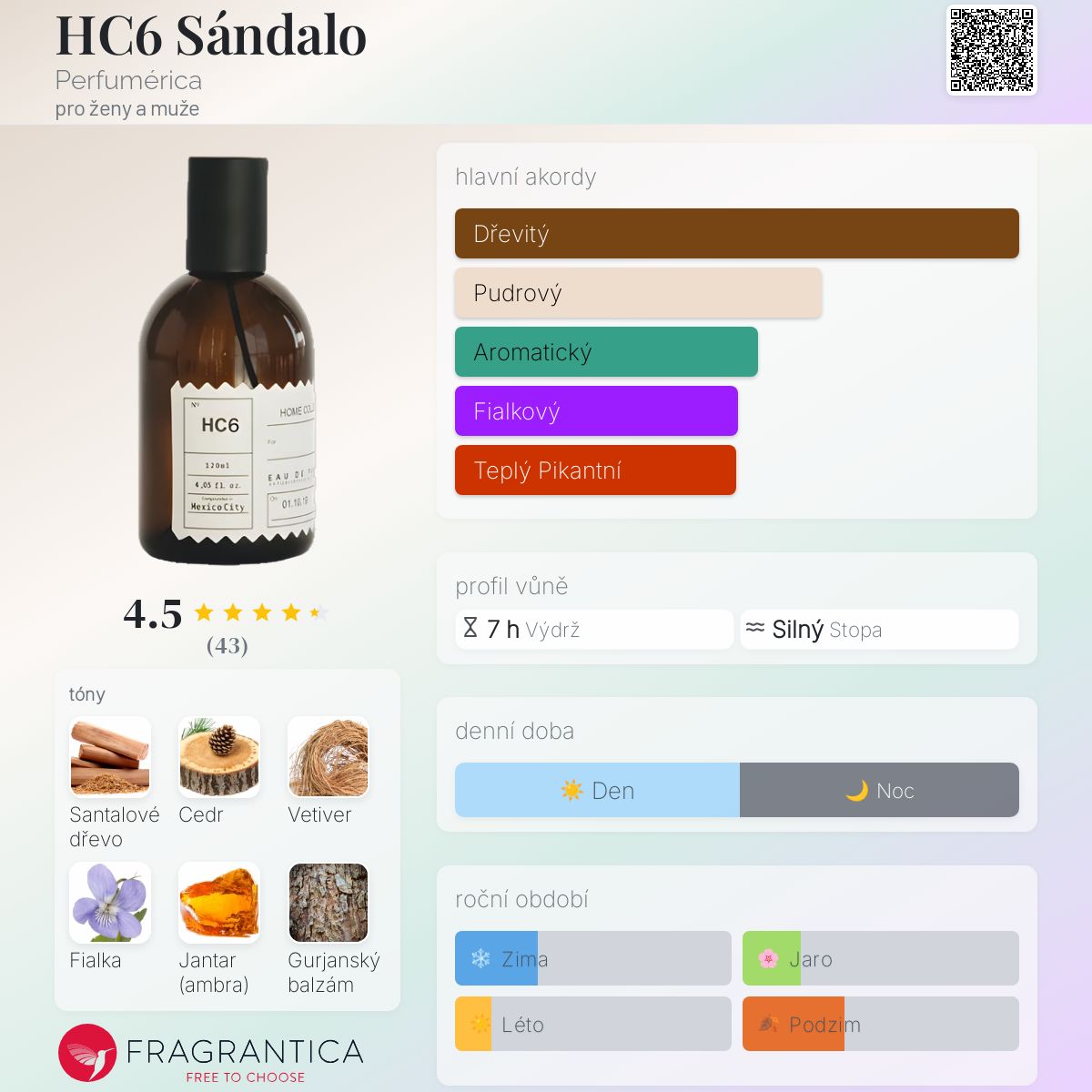 HC6 Sándalo podle Perfumérica je Woody vůně pro ženy a muže. HC6 Sándalo byl/a uveden/a v roce 2020. "Nosem" za touto vůní je José Alejandro Palafox Padilla. Vrchní tón je Santalové dřevo ; střední tóny jsouVirginský cedr a Fialka ; základní tóny jsou Bourbonský vetiver, Jantar (ambra) a Gurjanský balzám.
