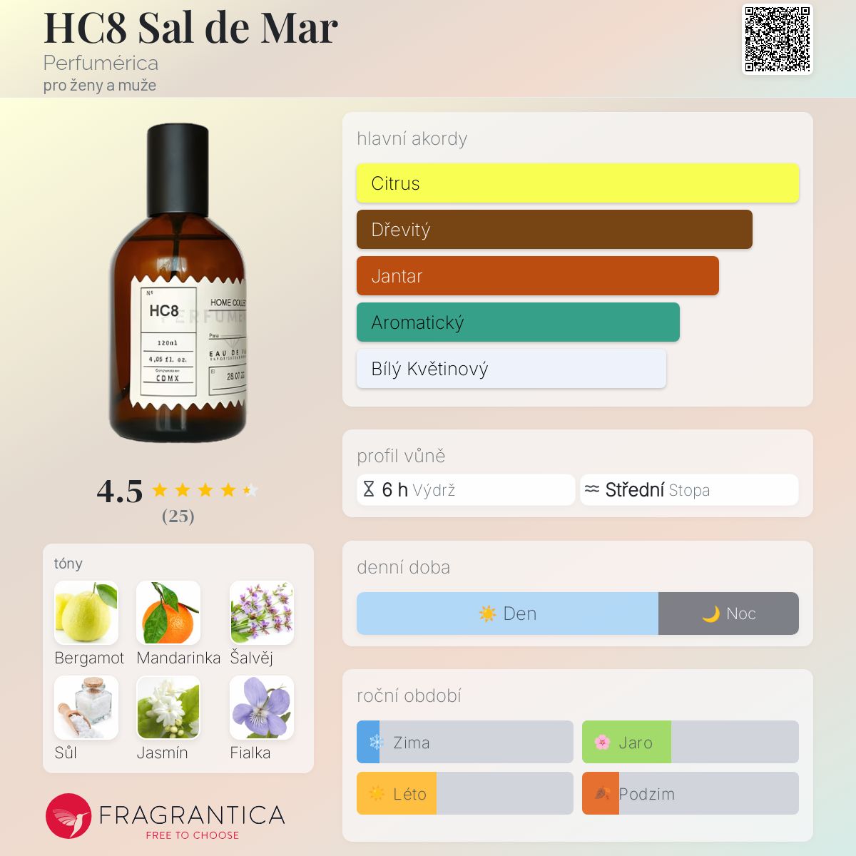 HC8 Sal de Mar podle Perfumérica je vůně pro ženy a muže. HC8 Sal de Mar byl/a uveden/a v roce 2021. Vrchní tóny jsou Bergamot, Mandarinka a Šalvěj; střední tóny jsouMořská sůl, Jasmín a Fialka ; základní tóny jsou Pačuli, Palisandr a Jantar (ambra).