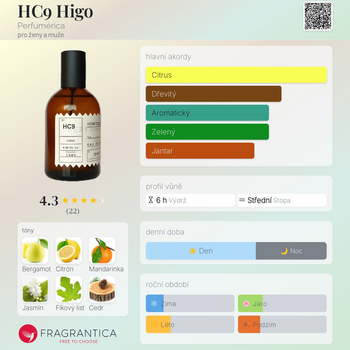 HC9 Higo podle Perfumérica je vůně pro ženy a muže. HC9 Higo byl/a uveden/a v roce 2021. Vrchní tóny jsou Bergamot, Citrón a Mandarinka; střední tóny jsouJasmín, Fíkový list, Cedr a Fík ; základní tóny jsou Jantar (ambra), Cedr a Vetiver.