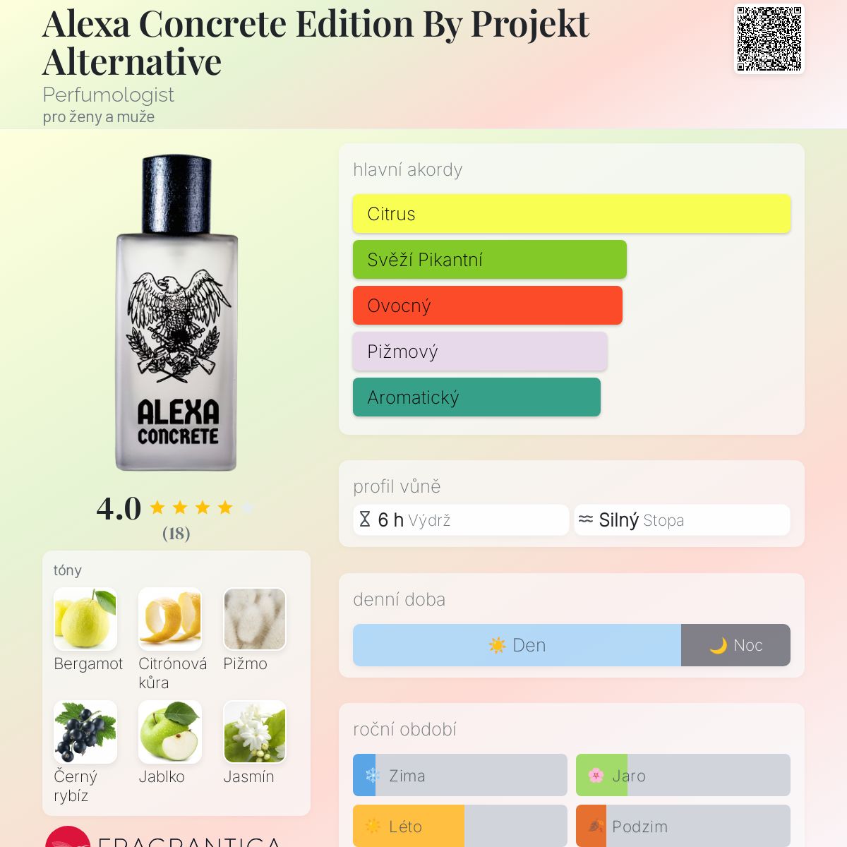 Alexa Concrete Edition By Projekt Alternative podle Perfumologist je vůně pro ženy a muže. Alexa Concrete Edition By Projekt Alternative byl/a uveden/a v roce 2019. Vrchní tóny jsou Bergamot, Citrónová kůra a Černý rybíz; střední tóny jsouJablko, Jasmín, Máta, Bříza a Růže ; základní tóny jsou Pižmo, Vanilka a Dubový mech.