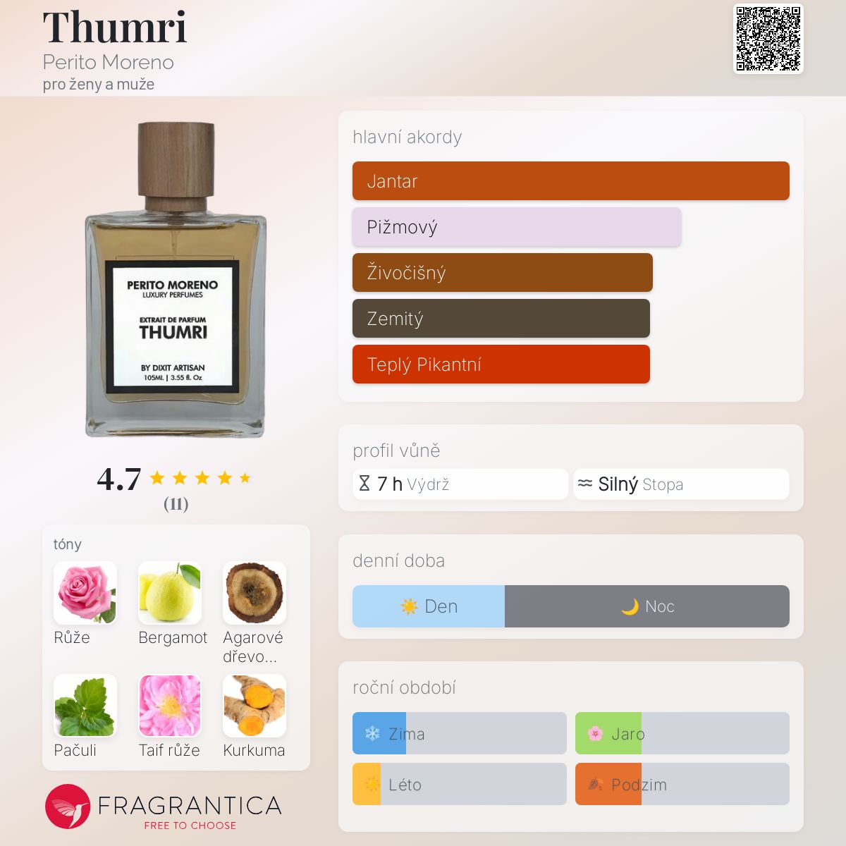 Thumri podle Perito Moreno je Orientální Floral vůně pro ženy a muže. Toto je nová vůně. Thumri byl/a uveden/a v roce 2024. "Nosem" za touto vůní je Nitish Dixit. Vrchní tóny jsou Turecká růže, Bergamot, Růže a Agarové dřevo (oud); střední tóny jsouPačuli, Taif růže, Kurkuma, Zázvor, Nard himálajský a Bulharský světlý tabák ; základní tóny jsou Fazole tonka, Ambra, Jantarový (ambrový) olej, Kastoreum, Labdanum, Vanilka, Benzoin, Dubový mech, Cibetka, Pižmo a Agarové dřevo (oud).