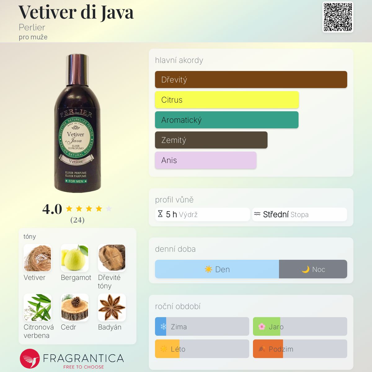 Vetiver di Java podle Perlier je vůně pro muže. Vetiver di Java byl/a uveden/a v roce 2013. Vrchní tóny jsou Bergamot, Citronová verbena a Badyán; střední tóny jsouVetiver a Dřevité tóny ; základní tóny jsou Cedr a Fazole tonka.