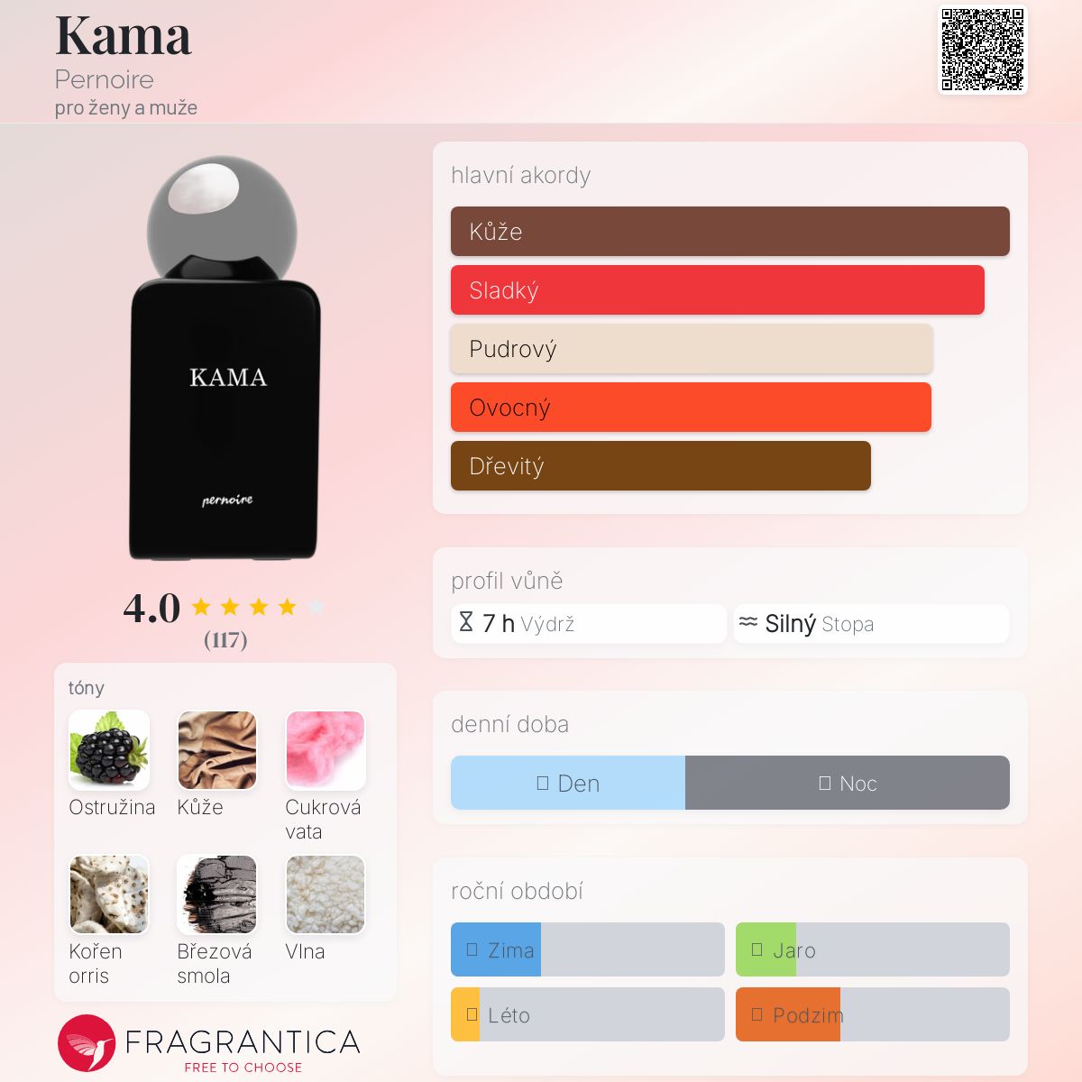 Kama podle Pernoire je Leather vůně pro ženy a muže. Toto je nová vůně. Kama byl/a uveden/a v roce 2024. "Nosem" za touto vůní je Andreas Wilhelm. Vrchní tóny jsou Ostružina, Orris, Březová smola a Fialka; střední tóny jsouKůže, Cukrová vata, Cypriolový olej a Jemný jantar (ambra) ; základní tóny jsou Vlna, Kašmír, Pižmo a Mech.