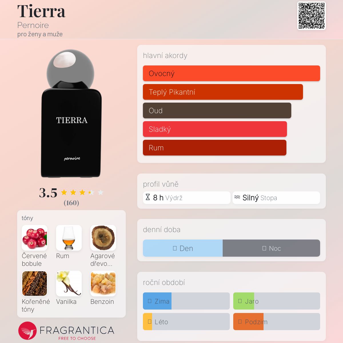 Tierra podle Pernoire je Woody Spicy vůně pro ženy a muže. Tierra byl/a uveden/a v roce 2021. "Nosem" za touto vůní je Andreas Wilhelm. Vrchní tóny jsou Červené bobule a Rum; střední tóny jsouKoření, Vanilka a Benzoin ; základní tón je Agarové dřevo (oud).